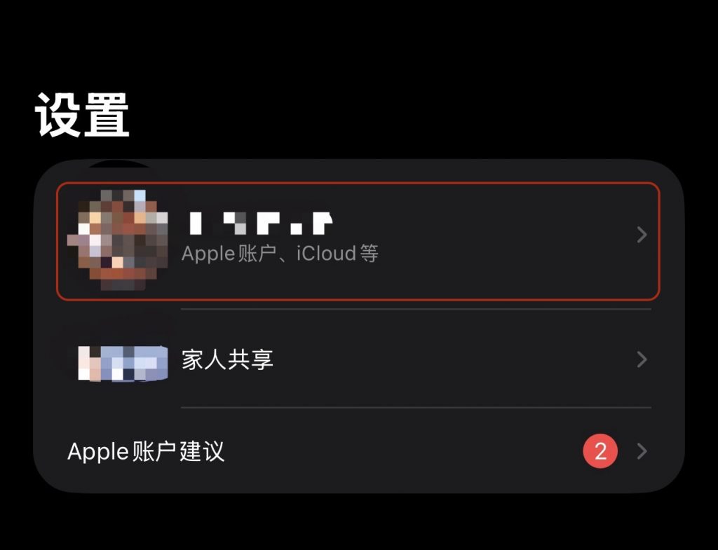 1、点击进入设置-> 第一行:Apple账户、iCloud等